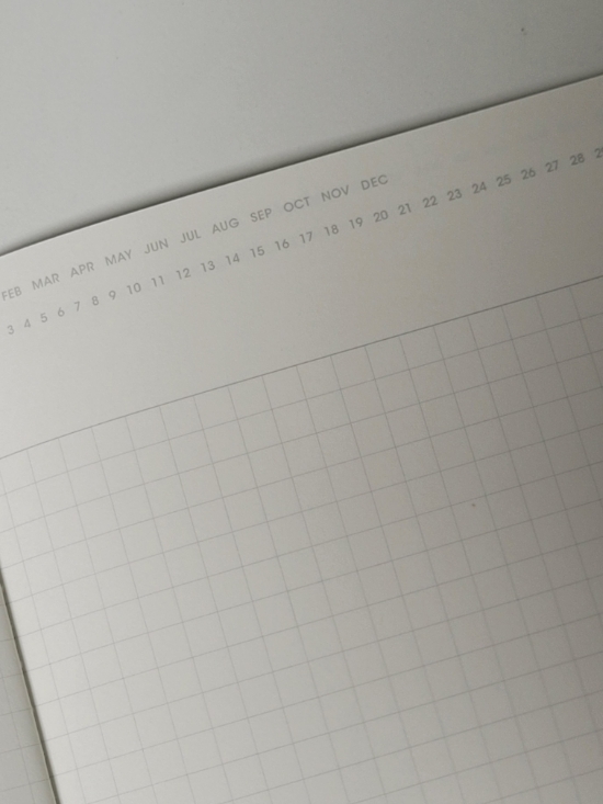 맨 뒤에는 자유양식으로 쓸 수 있는 모눈 페이지도 소량 마련되어 있었습니다. 상단에는 월/일을 표기할 수 있었어요. 스크랩 하고 싶은 자료를 붙여도, 자유롭게 낙서를 해도 좋을 것 같아요.