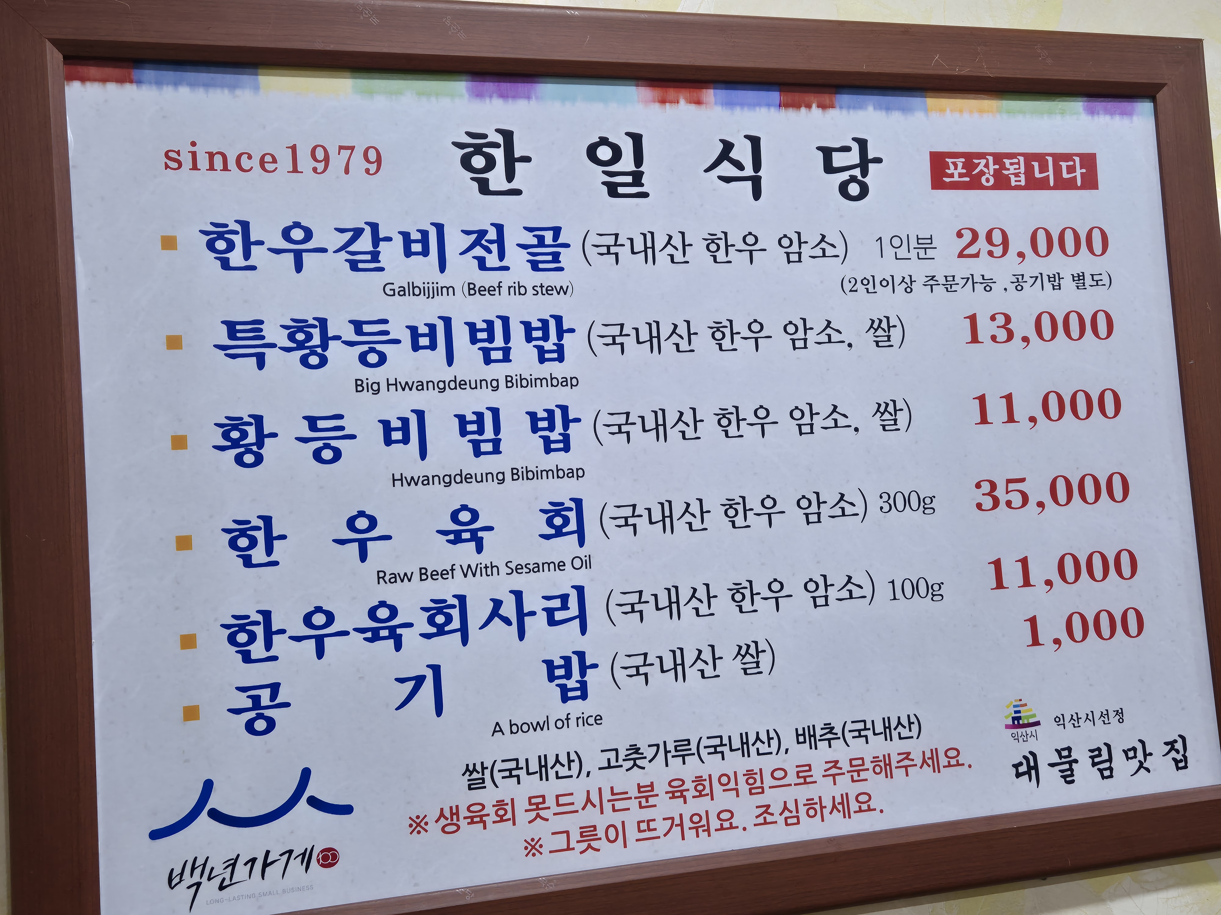 한일식당 메뉴판입니다. 한우갈비전골과 황등비빔밥 두 종류 메뉴로 나눠볼 수 있을 것 같아요.