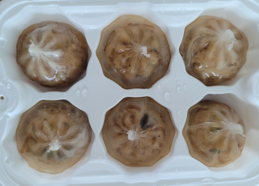 뚜껑을 개봉하지 않은 채로 전자레인지(700W 기준)에 3분 30초 돌렸습니다. 열어봤더니 동그란 만두 여섯 알이 나란히 있네요.